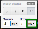 This can be particularly useful to trigger when a process stops. Previously, the pulse width trigger required an ending edge to trigger, even if there was no maximum pulse width time. However, to support this, the trigger was modified, and the “n/a” option was added.