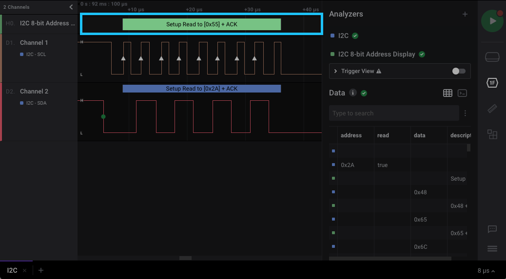 In certain scenarios, it may be preferred to view the address field as an 8-bit value (incorporating the R/W bit). We’ve added a high level analyzer (HLA) extension that allows for this feature.