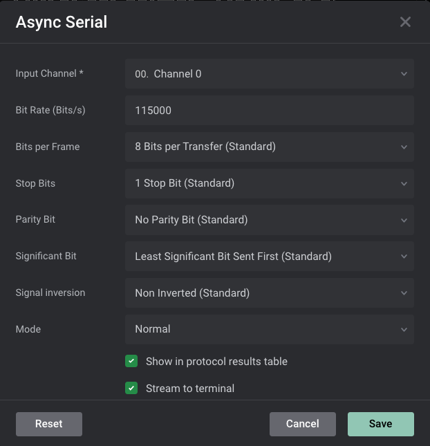 - The data bus is idling low and the Async signal is inverted, causing the data to be decoded improperly. In this case, make sure the Async Serial analyzer settings are set to Inverted.