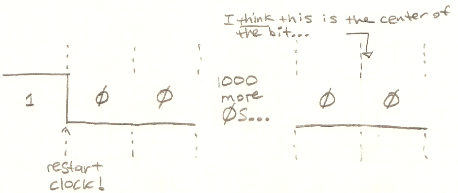 How do we know when enough time has passed that we’re now in the middle of our first actual data bit? Simple: We time it. This is how the serial port on the IBM PC did it, and it’s how a PIC or MSP430 or Arduino do it.