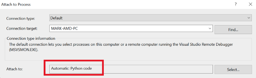 The solution for this is to ensure you follow the debugging instructions linked above. Depending on your Visual Studio default configuration, another option (such as “Python code” like shown in the image below) may be selected.