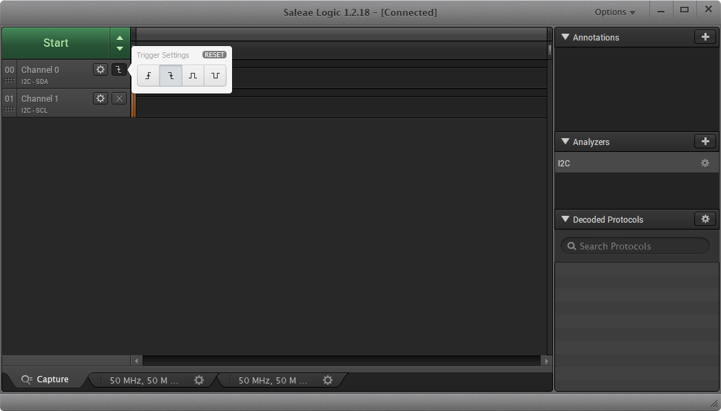 The data line (SDA) is normally the first signal to change during an I2C transfer. Because the lines are open drain, they will be nominally high, which means that we need to watch for a high-to-low transition. Click on the Trigger Button next to Channel 0 (I2C - SDA), and select the Trigger on Falling Edge option.
