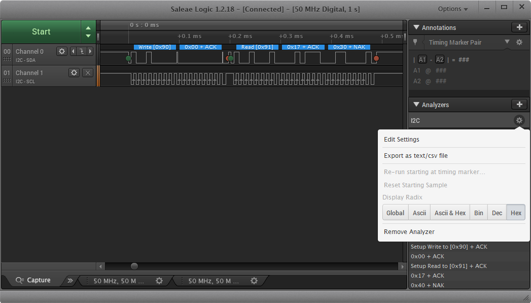 Zoom in around the 0 s : 0 ms : 0 μs mark, and you should see some I2C data. Click on the gear icon next to I2C under Analyzers. Click on Hex under Display Radix to show the interpreted data as hexadecimal.