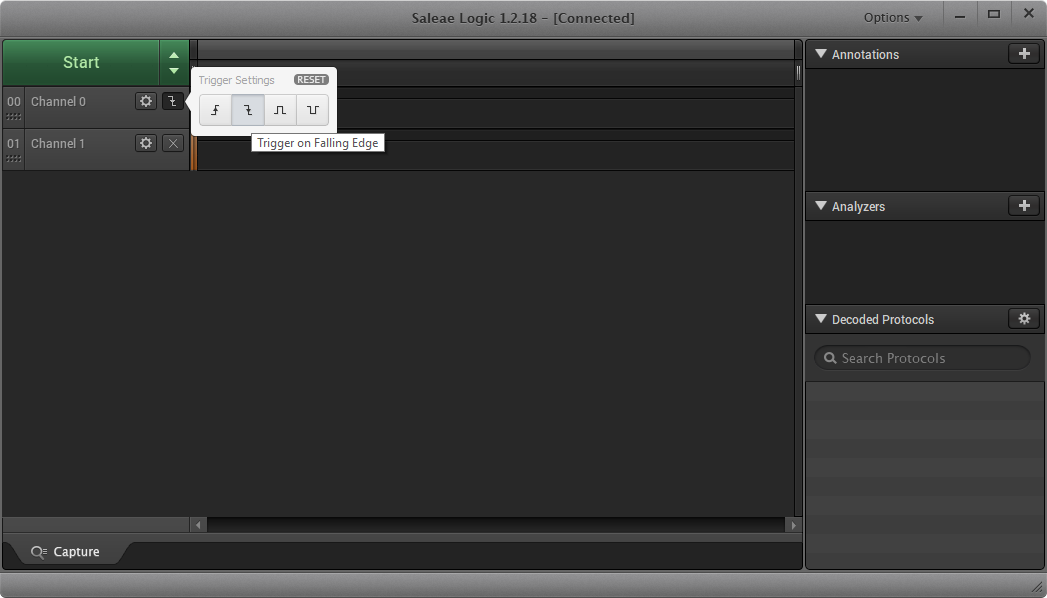 By default, triggering is set to occur on the rising edge of channel 0. UART is by default high, so we want to start capturing whenever the TX line drops low (start bit). Click the Trigger Button next to Channel 0 to bring up the Trigger Settings pop-up. Select the Trigger on Falling Edge option.
