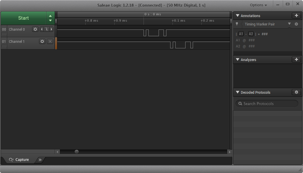 In the device settings window, set the speed to at least 50 MS/s and the duration to 1 second. Click both Clear buttons to disable all channels, leaving only the digital channel 0 enabled. Click the digital Channel 1 to enable it as well.