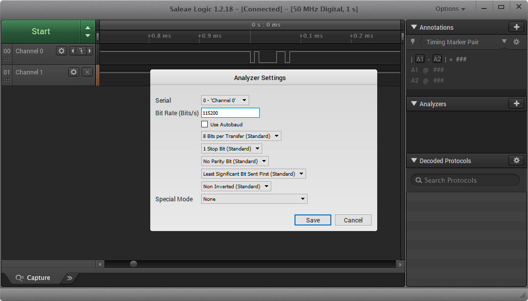 Click on the plus button (+) next to Analyzers on the right side of the Logic software. Select Async Serial to bring up the Serial settings window. Select 0 - ‘Channel 0’ for Serial, change the bit rate to 115200, and leave the rest alone.