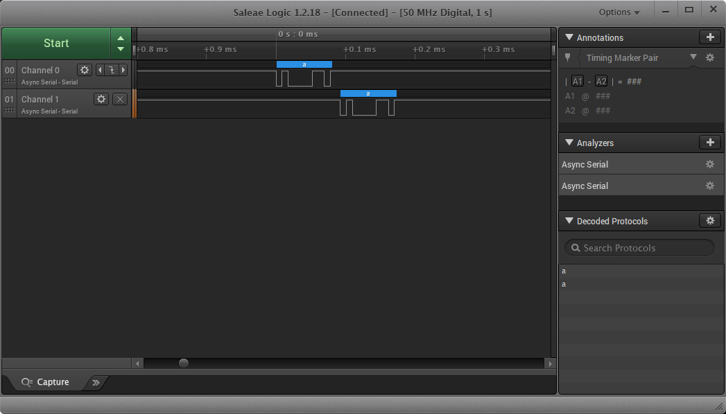 You should see two “Async Serial” bars appear under the Analyzers pane. Additionally, the captured serial data should both have the letter ‘a’ over them. This shows that you captured the ASCII letter ‘a’ going from the computer to the Nucleo and the same letter being echoed back.