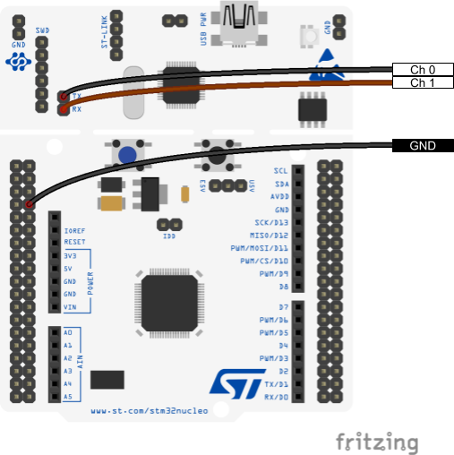 Connect the GND wire to an available ground pin on the Nucleo. Connect Channel 0 to TX and connect Channel 1 to RX.